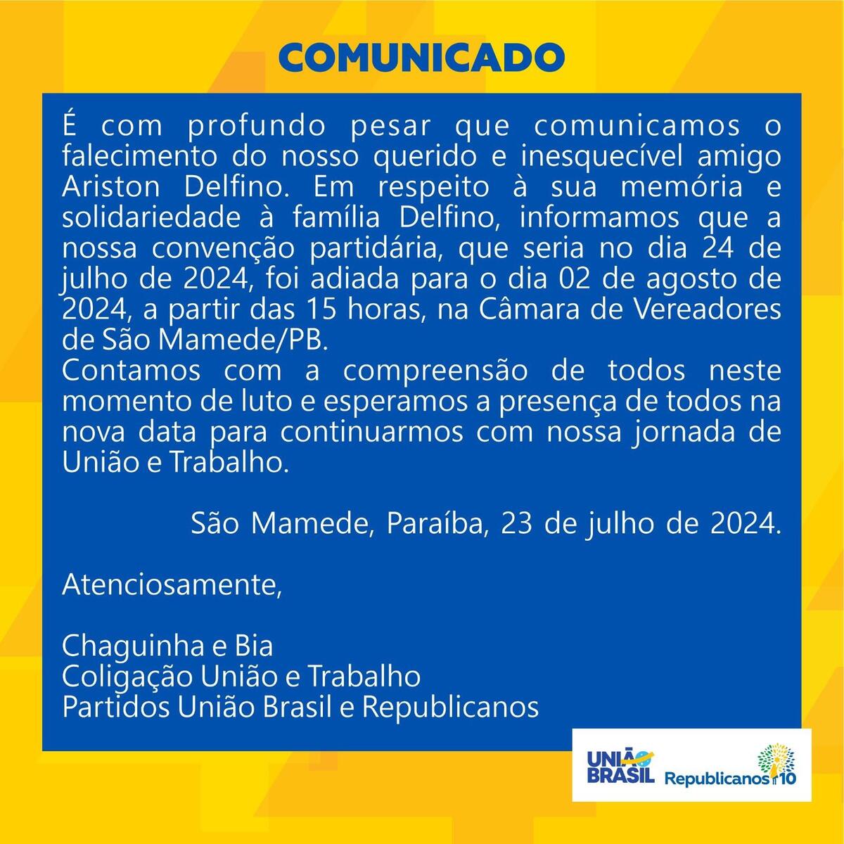 Na manhã desta terça-feira (23), ainda consternados pela morte do munícipe de São Mamede, Ariston Delfino, os partidos União Brasil e Republicanos do município de São Mamede que fariam convenção partidária conjunta, nesta quarta-feira, dia 24 de julho, resolveram adia-la em respeito à sua memória e ao luto de todos.
