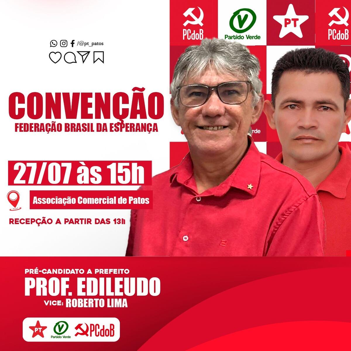 A referida Convenção vai homologar os nomes do Professor Edileudo Lucena para o cargo de Prefeito; do líder comunitário Roberto Lima para o cargo de Vice-Prefeito, e dos nomes de várias mulheres e homens que concorrerão aos cargos de vereadora e vereador representando as siglas que compõem a Federação Brasil da Esperança em Patos.