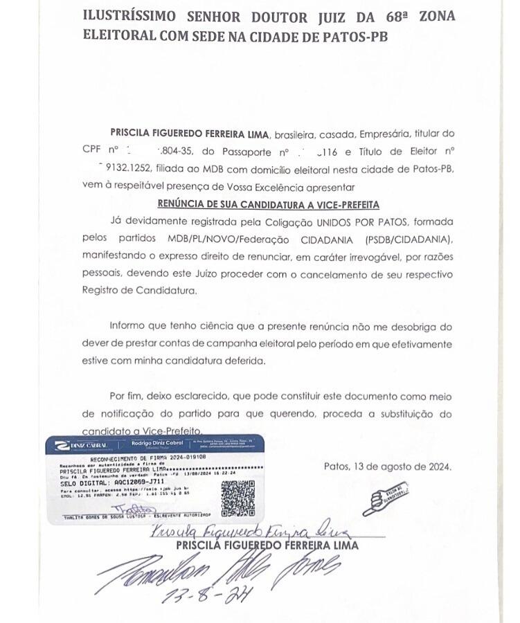 Portal 40 Graus tem acesso a documento de Priscila pedindo desistência de candidatura a vice