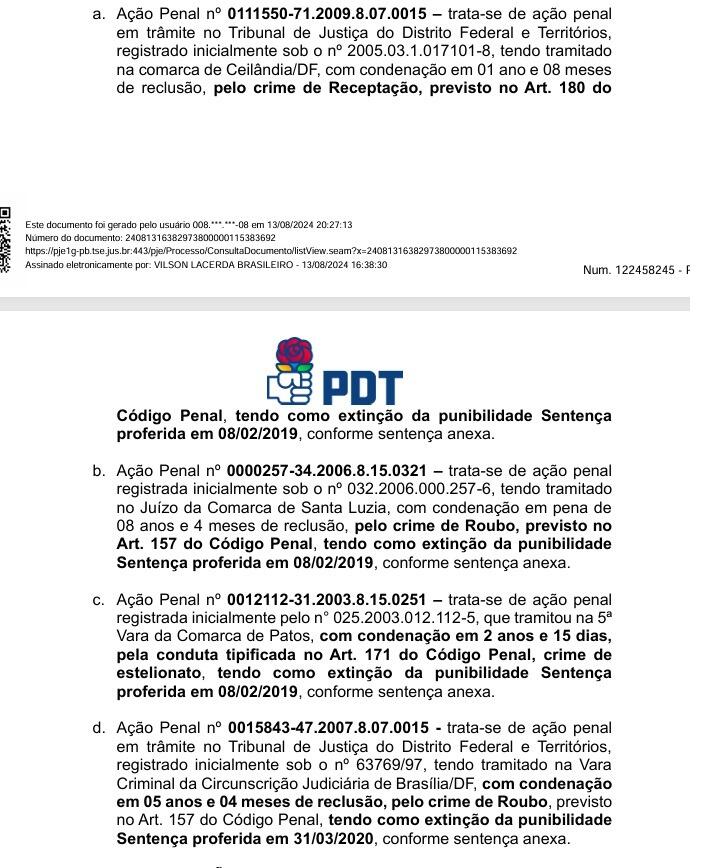 Para o PDT, “as condenações já expostas do pré-candidato atestam a urgente necessidade de indeferimento do registro de candidatura, ante a INELEGIBILIDADE do mesmo. Se observa que o pré-candidato possui condenações por órgão colegiado pela prática de estelionato previdenciário, de modo a torna-lo inelegível.”