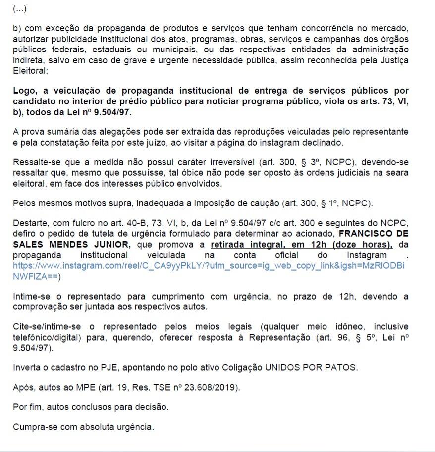 A magistrada determinou então que o vereador promova a retirada integral, em 12h (doze horas), da propaganda institucional veiculada na conta oficial do Instagram, sob pena de pagamento de multa.