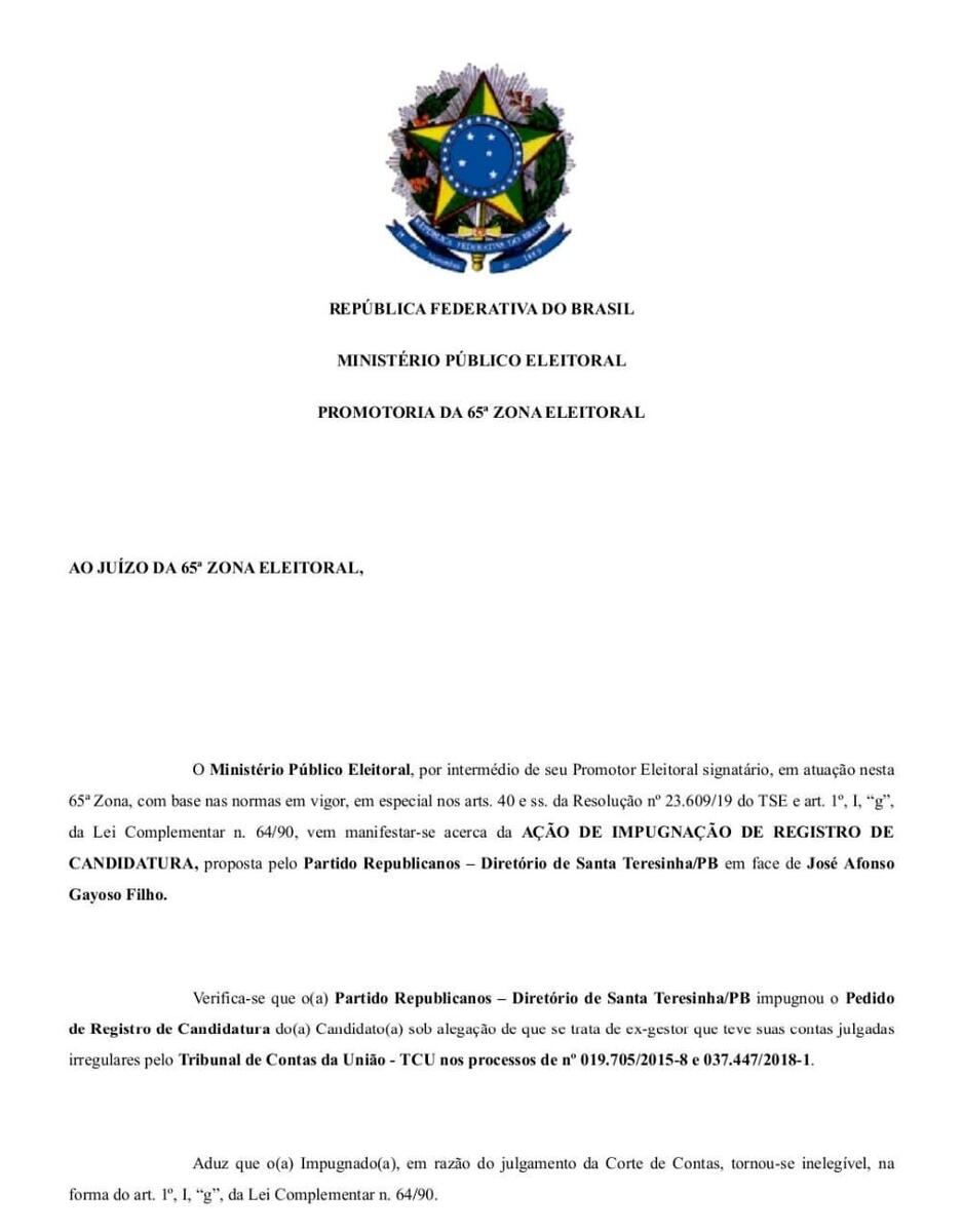 O Ministério Público Eleitoral emitiu parecer favorável à elegibilidade do ex-prefeito de Santa Terezinha, Zé Afonso (PSDB), candidato a prefeito do município nestas eleições.