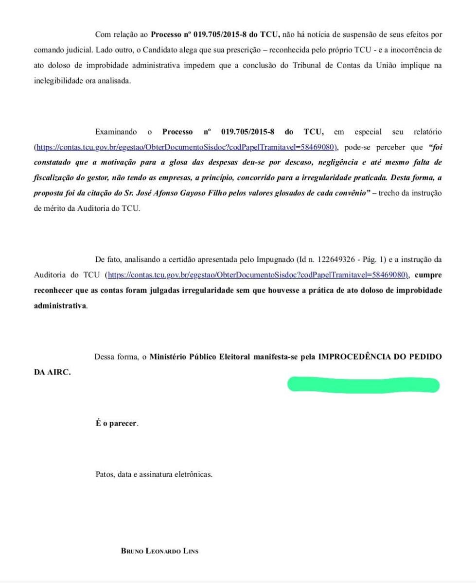 Em análise dos autos, o promotor da 65ª Zona Eleitoral, Bruno Leonardo Lins, reconheceu que, apesar da condenação, não há ato doloso, o que não gera inelegibilidade. Portanto, a promotoria manifestou-se pela improcedência do pedido de impugnação (AIRC).