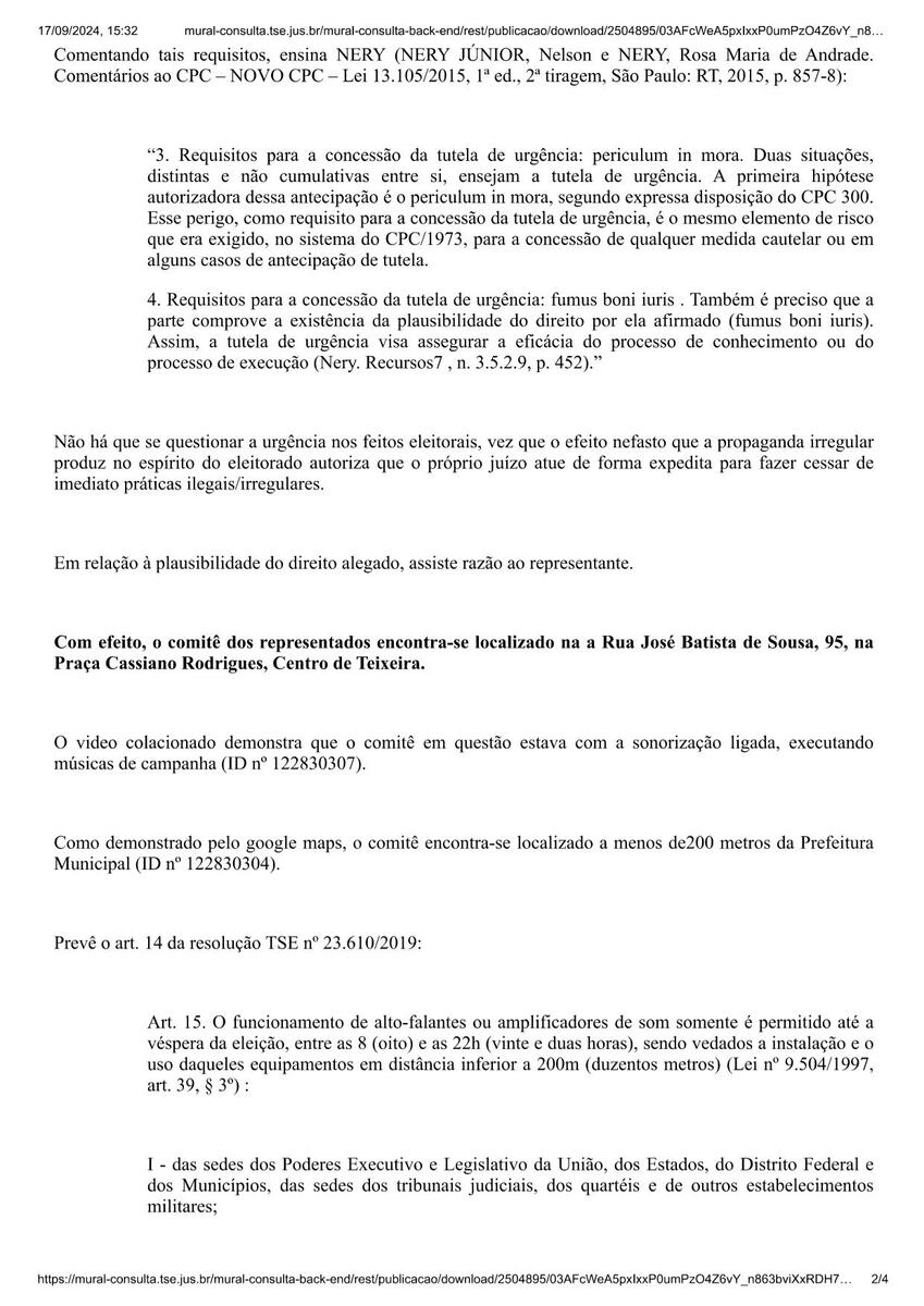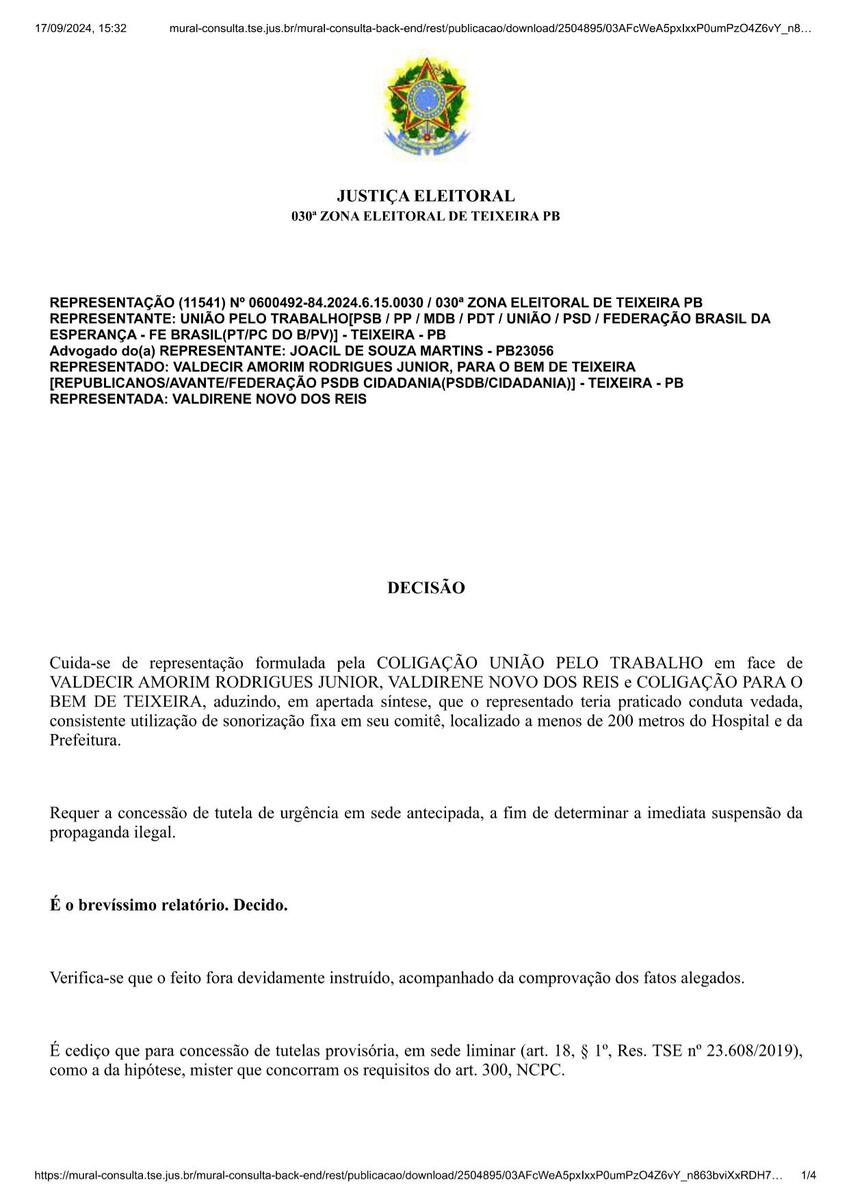 O juiz Carlos Gustavo Guimarães Albergaria Barreto, da 30ª Zona Eleitoral, proibiu o comitê do candidato Valdecir Júnior (Avante) de usar som no comitê, em atendimento a uma representação apresentada por uma coligação. A coligação do candidato Wenceslau Marques (PSB) acusa a coligação de Valdecir Júnior (Avante) de fixar som no comitê localizado a menos de 200 metros do hospital e da Prefeitura de Teixeira, o que é proibido por resolução do Tribunal Superior Eleitoral (TSE).