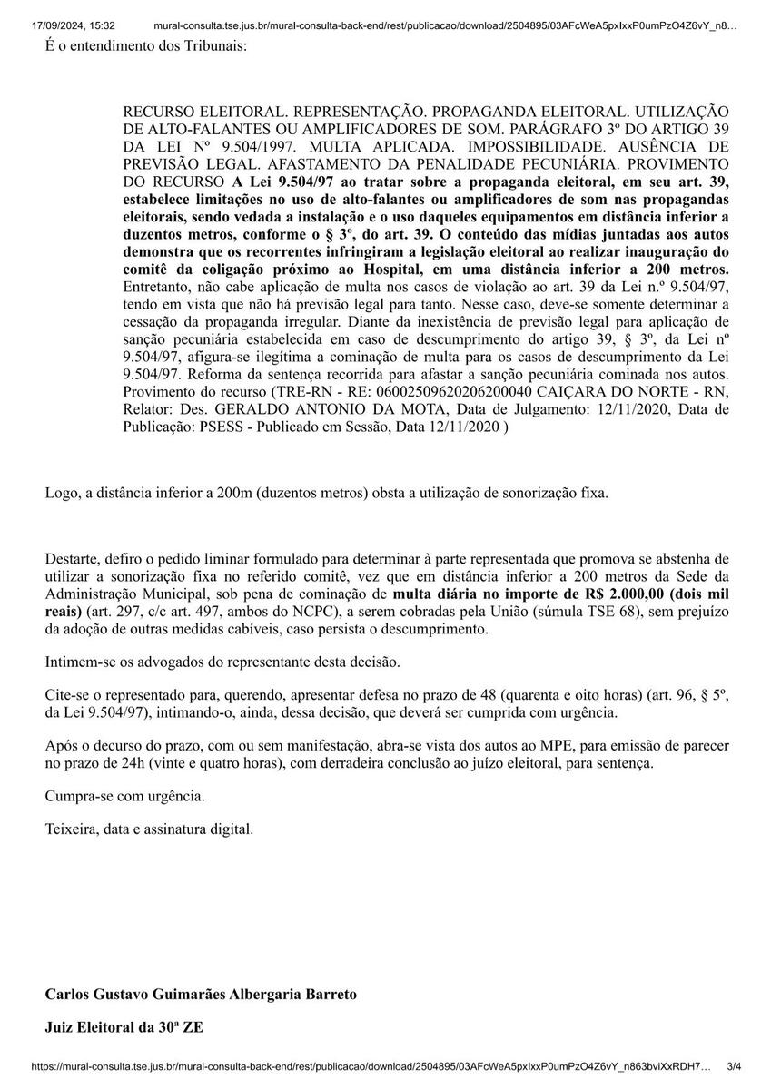 O magistrado considerou que o fatos alegados foram comprovados e determinou que a coligação e o candidato se abstenham de utilizar a sonorização fixa no referido comitê, vez que em distância inferior a 200 metros da Sede da Administração Municipal. Em caso de descumprimento, será aplicada multa diária de R$ 2 mil.