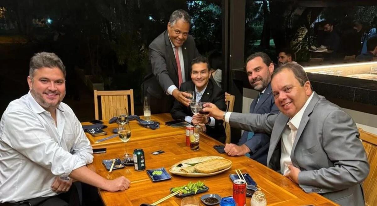 O encontro aconteceu em um restaurante japonês e reuniu os deputados Elmar Nascimento (União-BA), Marcos Pereira (Republicanos-SP) e Antônio Brito (PSD-BA).