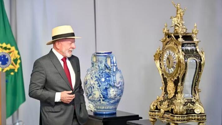 Lula observa vaso e relógio histórico restaurados no ato pelos 2 anos dos atos golpistas de 8 de janeiro — Foto: Evaristo Sá/AFP