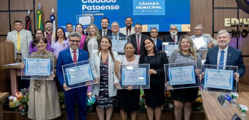 O primeiro homenageado foi o professor Edmilson da Silva Severo, que recebeu um Voto de Aplauso concedido pelo vereador Ramon de Chica Pantera, União. Em seguida, foi a vez do também professor Valdeir Pereira Silva (natural de São Mamede-PB), receber o Título de Cidadão Patoense concedido pelo vereador Emano Araújo, Solidariedade; a enfermeira Luiza Sátyro Morais de Medeiros (natural de São Mamede-PB, onde é vereadora) concedido pela colega Nadir, Republicanos; Luiz Antônio Rodas (natural de Teixeira-PB), concedido pela vereadora Tide Eduardo, Republicanos; Francisco Geraldo Medeiros Nóbrega, mais conhecido por Geraldo Bigodão (natural de Jardim do Seridó-RN), concedido pelo vereador Zé Gonçalves, PT; Maria Aparecida de Sousa Silva (natural da cidade de Malta-PB), concedido por Décio Motos, Solidariedade; Lídia Moura Silva, Secretária Executiva da Mulher e da Diversidade da Paraíba (natural de Regeneração-PI), concedido pela vereadora Fátima Bocão, Republicanos; Hugo Gomes Zaher, juiz d 7ª Vara em Patos (natural de São Paulo-SP), concedido pela Nadir, Republicanos; Maria Joseny de Lima Medeiros Assis (natural de Santa Teresinha-PB), concedido pelo vereador Zé Gonçalves, PT; Saturnino Azevêdo Xavier (natural de Piancó-PB), concedido pelo vereador Décio Motos, Solidariedade; e, por fim, o juiz Romero Marcelo da Fonseca Oliveira (natural de Ipojuca-PE).