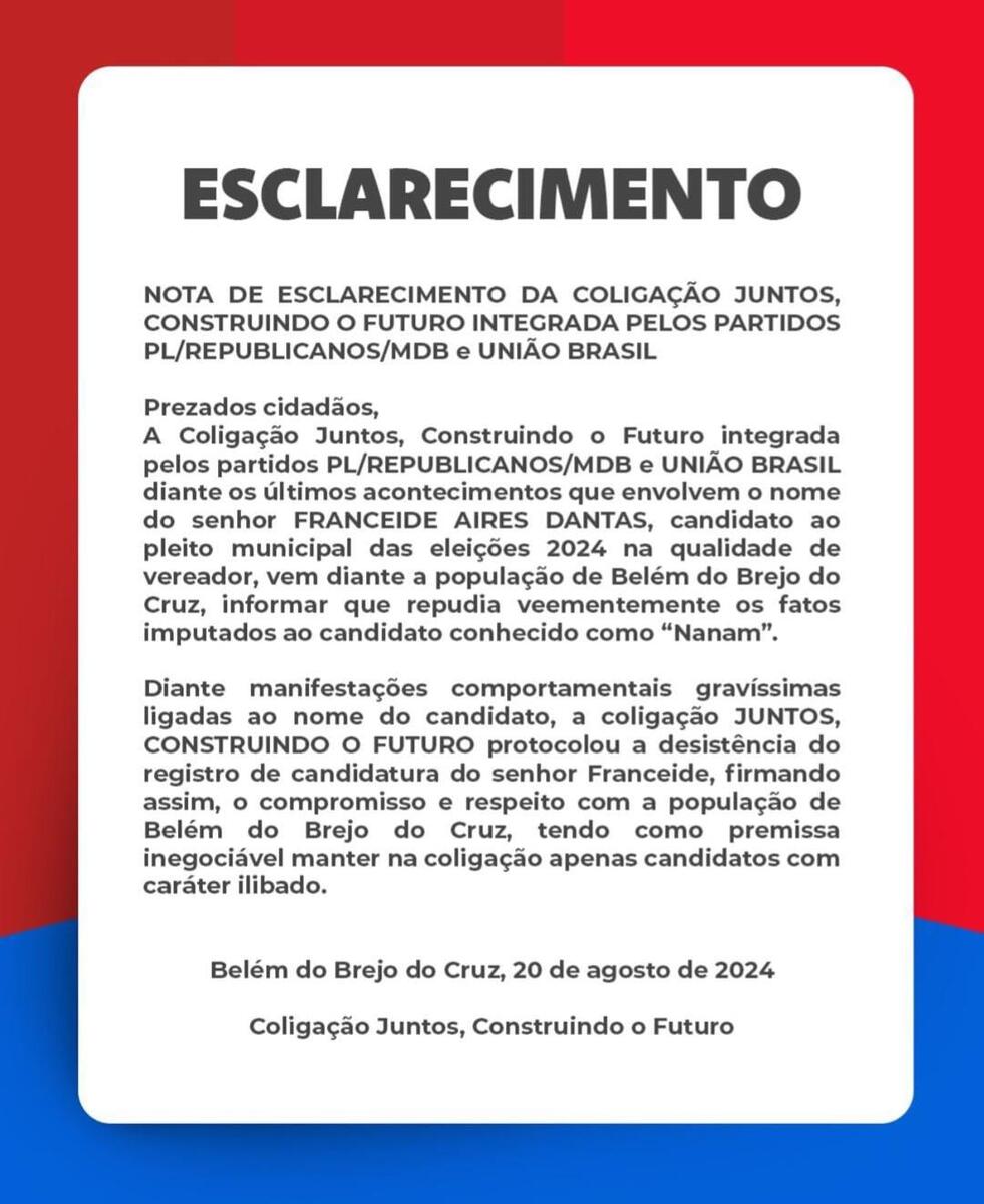 “Diante das manifestações comportamentais gravíssimas ligadas ao nome do candidato, a coligação Juntos, Construindo o Futuro protocolou a desistência do registro de candidatura do senhor Franceide, firmando assim, o compromisso e respeito com a população de Belém de Brejo do Cruz, tendo como premissa inegociável manter na coligação apenas candidatos com caráter ilibado”, conclui a coligação, na nota obtida pelo ClickPB.