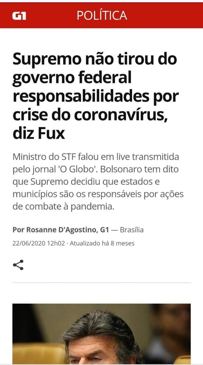 “O Supremo não exonerou o Executivo federal das suas incumbências porque a Constituição Federal prevê que, nos casos de calamidade, as normas federais gerais devem existir. Entretanto, como a saúde é direito de todos e dever do estado, num sentido genérico, o estado federativo brasileiro escolheu o estado federado em que os estados têm autonomia política, jurídica e financeira”, disse Fux.