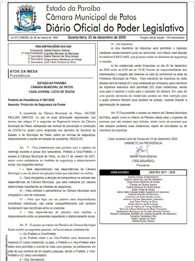 A posse dos vereadores, prefeito e vice-prefeito de Patos, marcada para o dia 1º de janeiro, será restrita a poucas pessoas devido à pandemia. A portaria que foi baixada pela Câmara Municipal de Patos, através de sua presidente Tide Eduardo, na tarde desta quinta-feira, 24 de dezembro, prevê todo um protocolo de segurança para quem vai adentrar às dependências da Câmara Municipal de Patos durante