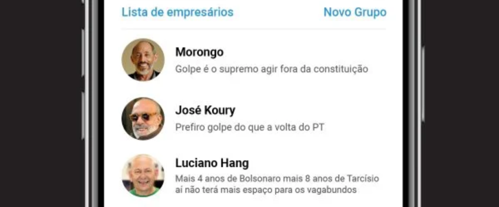 O grupo golpista reúne grandes empresários de diversas partes do país, desde nomes conhecidos como Luciano Hang, dono da Havan; Afrânio Barreira, do Grupo Coco Bambu; José Isaac Peres, dono da gigante de shoppings Multiplan; e outros menos famosos, como José Koury, dono do Barra World Shopping, no Rio de Janeiro; Ivan Wrobel, da construtora W3 Engenharia; e Marco Aurélio Raymundo, o Morongo, dono da marca de surfwear Mormaii.