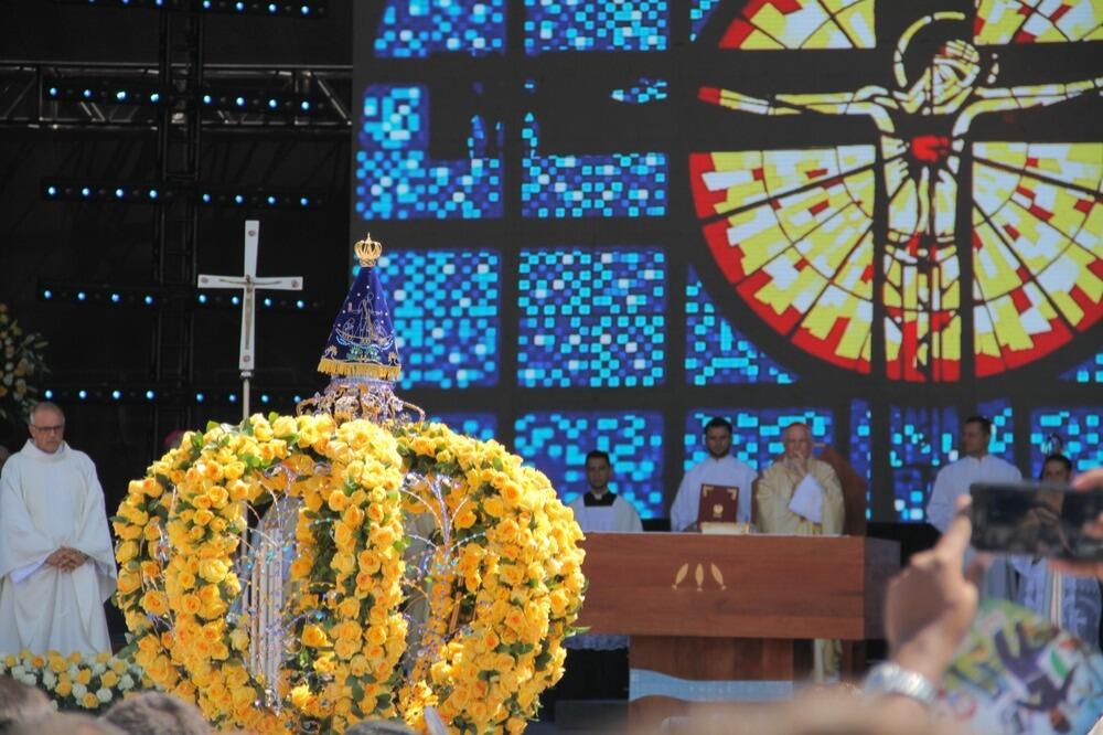 Debaixo de sol, com calor de 36ºC ,uma multidão acompanhou missa da celebração do jubileu. Na homilia, a igreja destacou o exemplo de Maria e relembrou os 300 anos de fé dos brasileiros na padroeira.