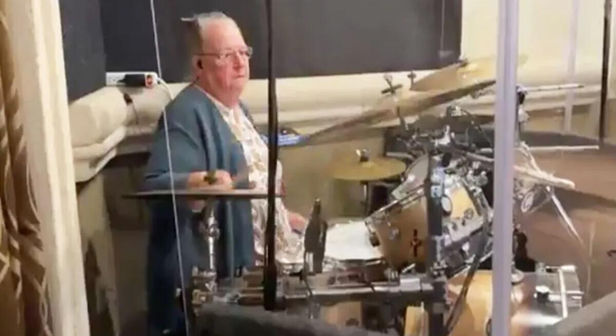 Uma mulher de 72 anos toca bateria na equipe de louvor durante o culto da igreja. Ela tem mostrado que a idade não importa ao servir ao Senhor. No dia 10 de julho, o evangelista Jason Beardsley fez uma transmissão ao vivo no Facebook durante um dos cultos da Calvary United Pentecostal Church.