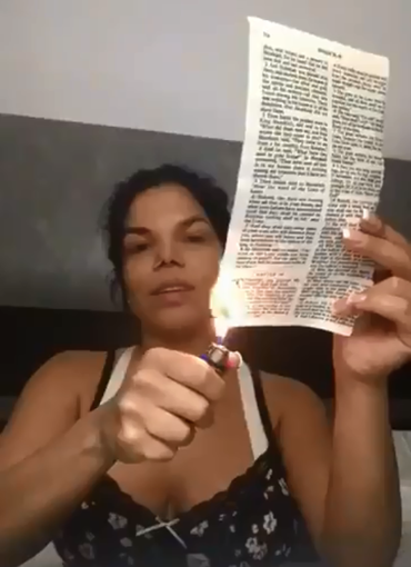 Ela inicia dizendo: “Um Salmo para os crentes que falaram que eu não sou filha de Deus, que eu sou uma pessoa do demônio. Vou ler um Salmo para vocês”. Após ler um trecho do Salmo 91, rasga uma folha da Bíblia e queima o livro. “Crente merda, crente lixo, queimem no inferno suas pestes, capeta”, encerra.