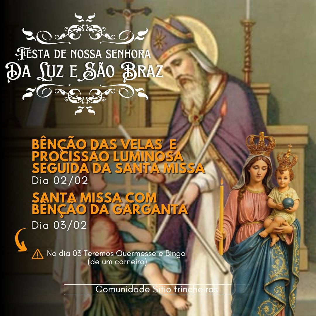O padre Elson Brasil, administrador Paroquial da Paróquia de São Francisco, situada no Noé Trajano, convida a comunidade católica para participar destas significativas festas religiosas(Nsra. Da Luz e São Braz), na comunidade Trincheiras.