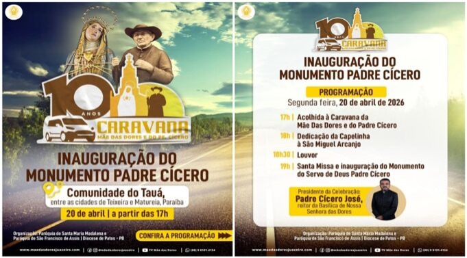 A visita da Caravana Mãe das Dores e do Pe. Cícero, de Juazeiro do Norte (CE), acontecerá na comunidade do Tauá, na segunda-feira, 20 de abril de 2026, localizada entre os municípios de Teixeira e Matureia, nas paróquias de Santa Maria Madalena e São Francisco de Assis, respectivamente.