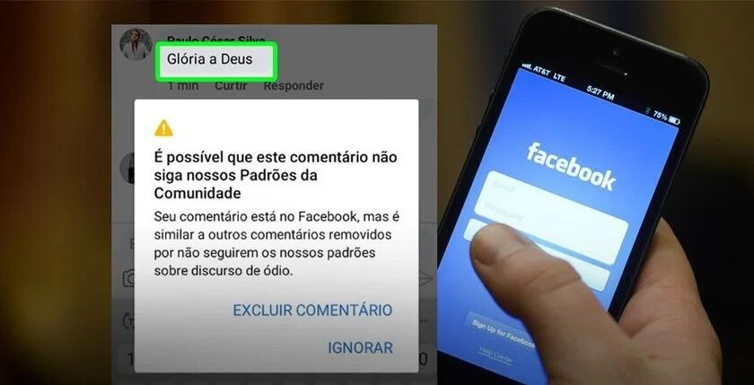 A mensagem informa que esse conteúdo pode estar em desacordo com os Padrões de Comunidade sobre discurso de ódio, e em seguida, dá ao usuário a possibilidade de excluir o comentário ou ignorar o alerta feito.