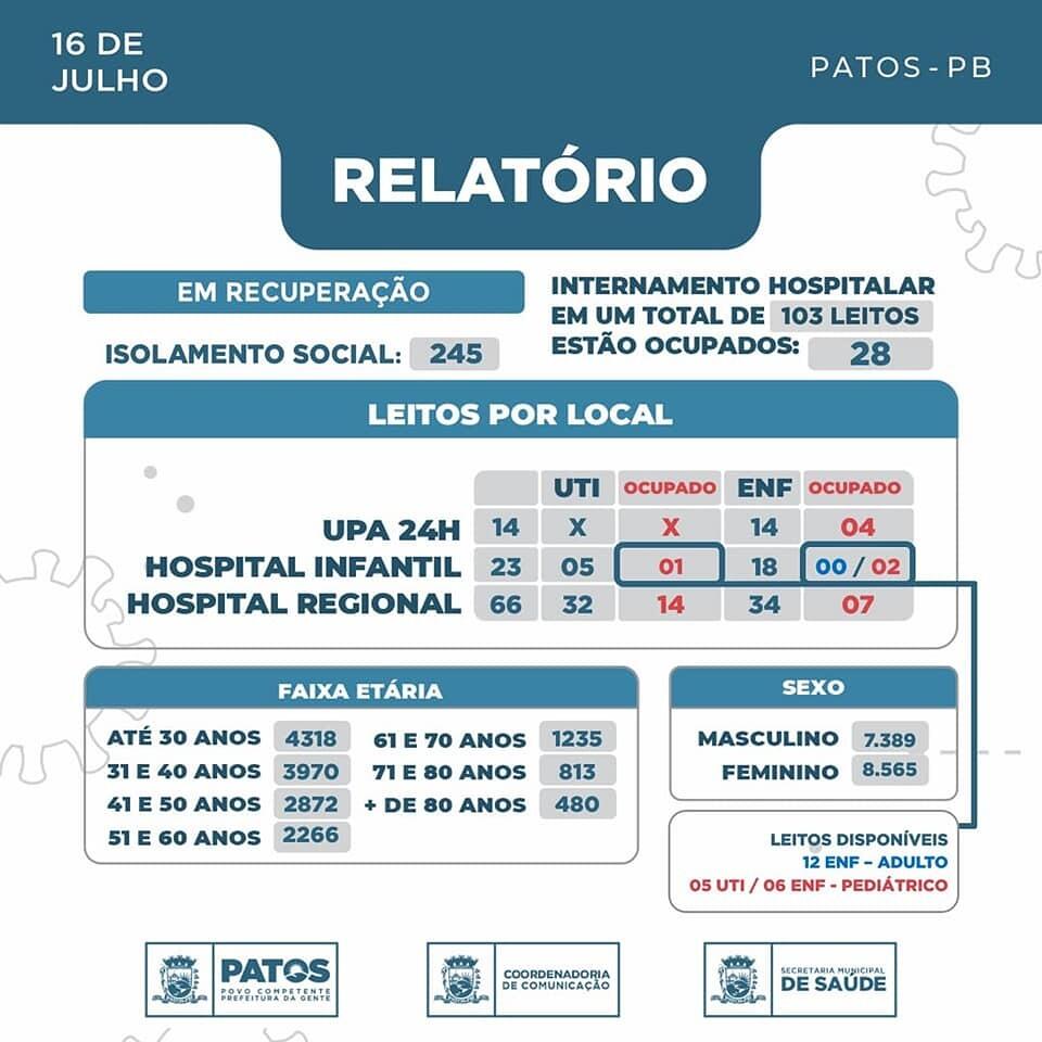 Desde o início da pandemia do novo coronavírus, a cidade de Patos registrou o total de 15.954 pessoas infectadas pelo vírus.
