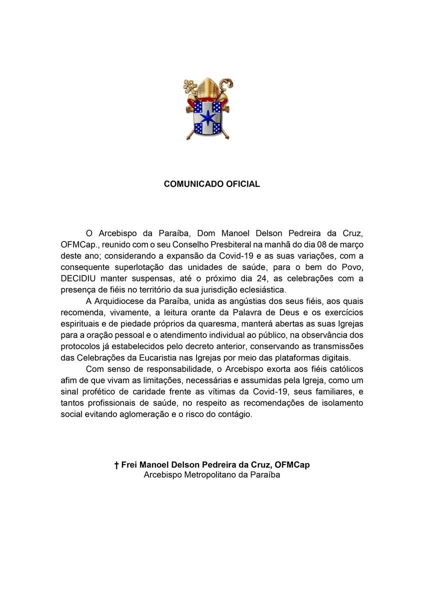 O Arcebispo da Paraíba, Dom Manoel Delson, decidiu manter suspensas as celebrações presenciais em sua jurisdição até o dia 24 de março. A decisão ocorreu após reunião com o Conselho Presbiteral, na manhã dessa segunda-feira (8), e considerou a expansão da Covid-19 e as suas variações, com a consequente superlotação das unidades de saúde.