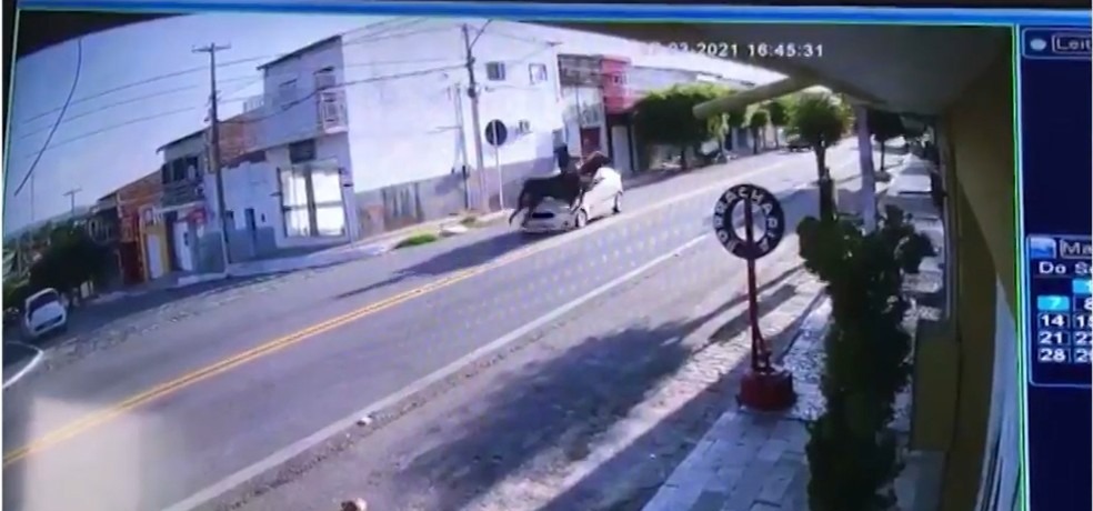 As imagens mostram uma mulher montada no animal que galopava, em velocidade, em direção à rua asfaltada. A mulher não consegue deter o animal que atravessa a rua e é atingido em cheio por um carro. Ambos caem no chão, mas o animal se levanta e vai embora do local.
