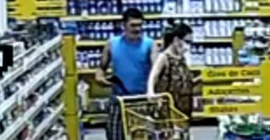 Nas imagens, é possível ver a cliente com um carrinho de compras escolhendo produtos quando o suspeito, utilizando uma camiseta azul, rende a vítima com uma suposta arma de fogo. Em seguida, ele pega o colar que a mulher estava usando e foge.