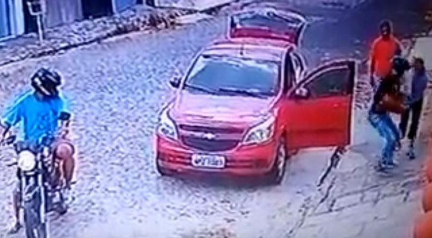 A imagem da câmera mostra que o assalto aconteceu ao meio-dia. Um homem e uma mulher parecem estar chegando em casa e o homem retira uma caixa do porta-malas. Enquanto isso, a dupla de assaltantes para a moto, o ocupante da garupa desembarca e saca a arma contra as vítimas.